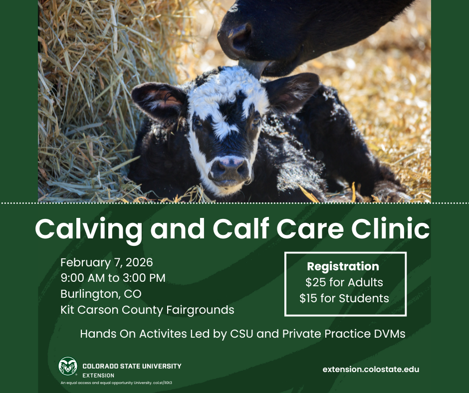 Colorado State University (CSU) Extension will be hosting a Calving and Calf Care Clinic on February 7, 2026 at the Kit Carson County Fairgrounds in Burlington, Colorado. The program will cover several topics including dystocia management, neonatal calf health, utilizing epidurals, handling colostrum and stressed calves.